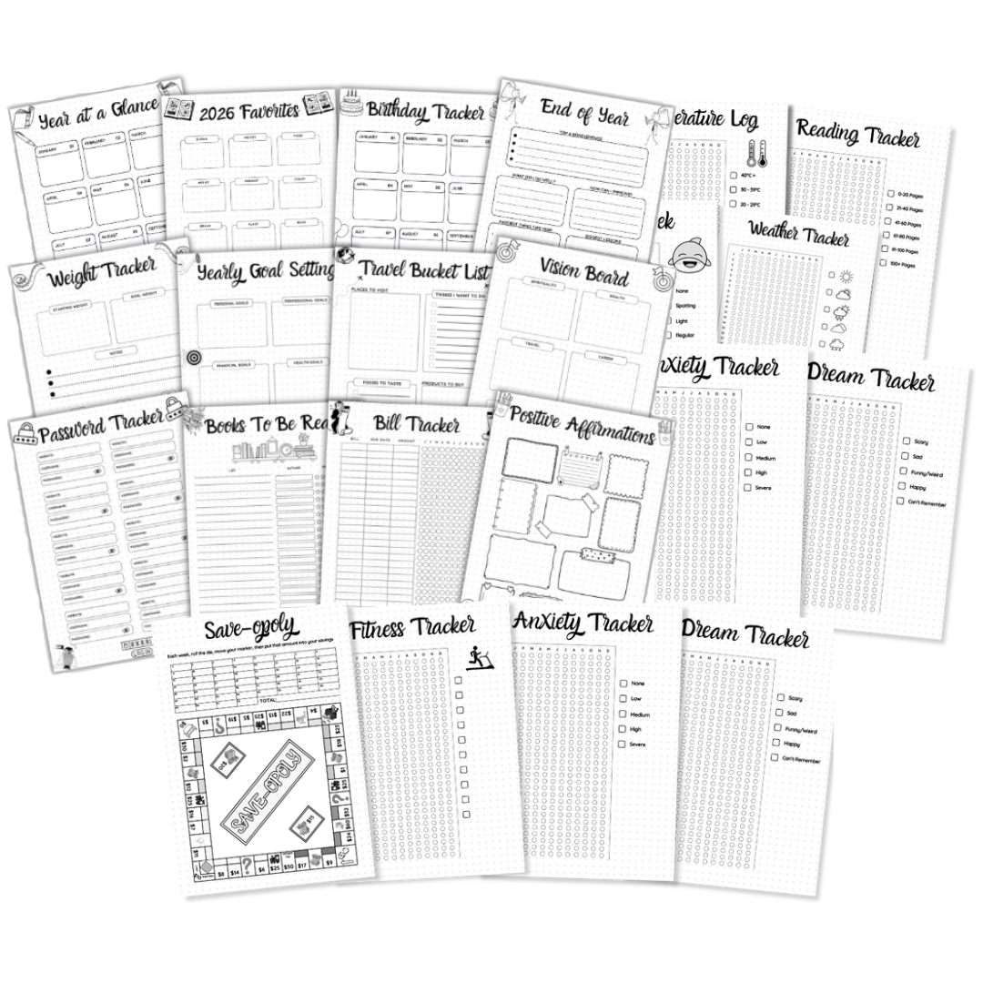 इसके अलावा, वे शार्क सप्ताह ट्रैकिंग और चीजों को खेलने योग्य और उत्पादक रखने के लिए एक पैसे की बचत खेल जैसे मज़ा एक्स्ट्रा शामिल हैं।. अपने दैनिक जीवन पर टैब रखने के दौरान व्यवस्थित और मनोरंजक रहें!पैक #1 इन ट्रैकर्स शामिल हैं: